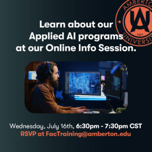 Join us on Wednesday, July 16th at 6:30 pm CST on Zoom for an exclusive Information Session for our New MS in Applied Artificial Intelligence (AI) program with Program Coordinator: Dr. John Sinclair. Learn how this cutting-edge program can unlock new career opportunities, deepen your expertise in AI, and prepare you for the tech of tomorrow.