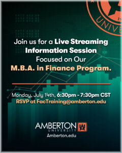 Join us on Monday, July 14th at 6:30 pm CST on Zoom for an exclusive Information Session for our MBA Finance program with Program Coordinator: Dr. Johnathan Schultz. Learn how this innovative MBA in Finance can unlock new career opportunities, deepen your expertise in financial management, and prepare you for leadership in the evolving financial landscape.