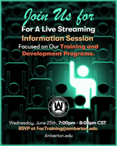 Join us on Wednesday, June 25th at 7:00 pm CST on Zoom for an exclusive Information Session for our MS in Training & Development program with Program Coordinator: Dr. Robert Rupe. Discover how this innovative program can help you craft impactful training programs, advance your career, and make a difference in workforce development.