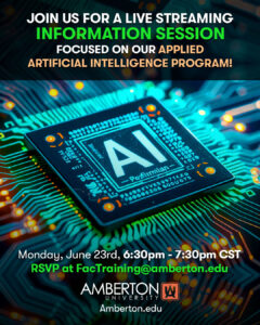 Join us on Monday, June 23rd at 6:30 pm CST on Zoom for an exclusive Information Session for our New MS in Applied Artificial Intelligence (AI) program with Program Coordinator: Dr. John Sinclair. Learn how this cutting-edge program can unlock new career opportunities, deepen your expertise in AI, and prepare you for the tech of tomorrow.